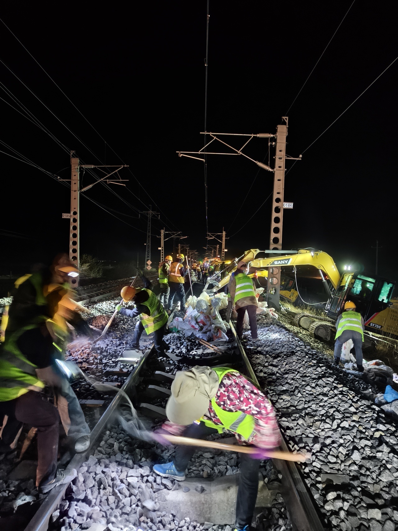 22时整,“天窗”命令下达。人员机具迅速上道,开始对冻害地段道床进行破底开挖,现场立刻尘土飞扬,机械轰鸣声、号子声、对讲机的联控防护声和铁锹与道砟的碰撞声交织一起,在青海湖畔奏响一曲盛大的“交响曲”。