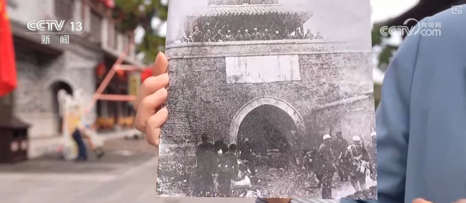 莒国古城里到处都是喜气洋洋、热闹非凡。这张特殊的照片取景地就是在这里,这是当年莒城解放战后的情形,战士们登上了城楼,定格下了这份来之不易的胜利。