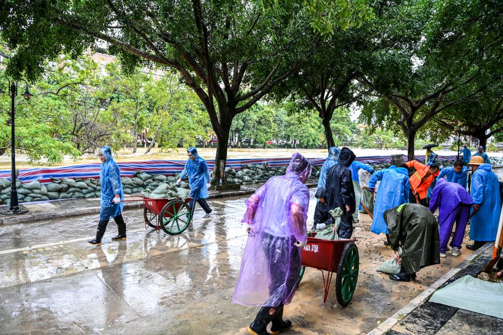 10月7日,广西百色市德保县的工作人员在抢运沙袋加固河道防洪堤。新华社记者曹祎铭摄 “现在鉴河河流水位还在上涨,水位高、流量大、流速快,对堤防的考验很大。”德保县城管局局长岑忠欧说,县里各部门组织近300人争分夺秒地对薄弱堤段进行加固,全力确保城区安全。 受灾群众的转移安置和生活保障工作已展开。位于德保县那甲镇敬老院的安置点内,虽然窗外风雨未歇,但室内秩序井然,从受灾村屯转移过来的群众在这里得到妥善安置。 “我家地势比较低,水没过了一楼。在工作人员的帮助下顺利安全转移。”那甲镇多睦村多目屯村民黄廷见回忆起受灾情形仍心有余悸,“住在镇里的安置点,各方面保障完善。” 据了解,多目屯共有常住人口62户117人,均已安全转移,其中有38人转移至那甲镇敬老院安置点。