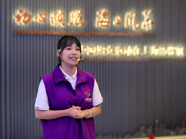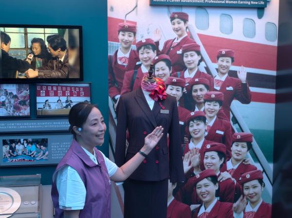 四位来自不同领域的讲解员为观众带来一场沉浸式的观展体验,并分享了她们投身志愿讲解的初心与感悟。中共四大纪念馆宣教专员、全国巾帼文明岗成员孙露依每天在红色场馆工作,时刻能感受到历史的温度,参与此次讲解,让她更加深刻体会到妇女解放先驱们的每一次觉醒都与民族命运紧密相连:“我愿将这份对历史的敬畏,化作更有感染力的时代回响。” 全国三八红旗集体成员、春秋航空客舱服务部安全保卫质量处副经理周静华将客舱安全管理中的严谨与细致融入讲解:“正如我们在万米高空守护旅客安全,妇女事业的发展同样需要坚实保障与社会合力。我愿用声音传递这份来之不易的‘安全感’与‘幸福感’。” 全国三八红旗手吴尔愉结合自身奋斗历程,诠释了“奋进·建功”的时代内涵。她分享道:“作为三八红旗手,我们不仅是时代的见证者,更是参与者和建设者。讲述妇女故事,就是讲述国家发展的壮阔历程。而我们,正是这一历程的亲历者与受益者。” 全国三八红旗手王黎娜站在展板前戴着麦克风,仿佛在与展览中的历史人物对话,她曾在田埂上见证了女性力量如何改变乡村,如今她真正读懂了“红旗手”的深意:“我们接过的,是一代代女性用智慧与勇气点燃的火种,让我更加感受到薪火相传的责任感。”