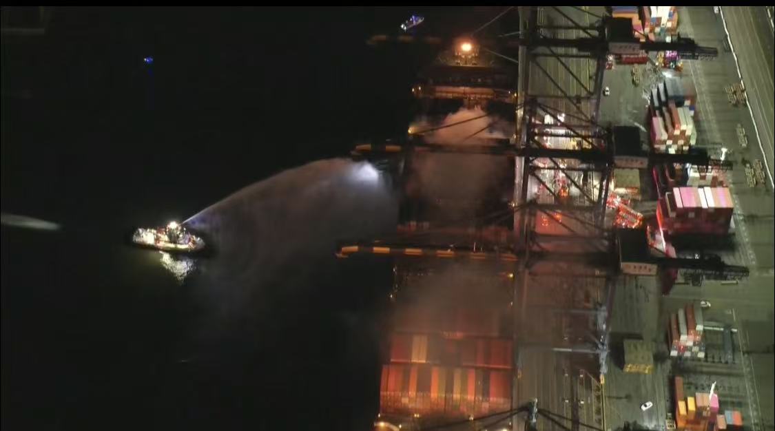 当地时间11月21日,美国洛杉矶市市长卡伦·巴斯证实,洛杉矶港一艘集装箱船上发生电气火灾,超过100名消防员前往现场灭火。