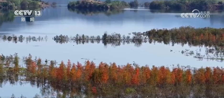 据了解,彩林景观带是重庆开州区在汉丰湖国家湿地公园内,通过实施林泽工程治理消落带形成的生态景观。经过多年的生长,树木逐渐成林,枝繁叶茂,不仅固土护岸,也丰富了汉丰湖的生物多样性。
