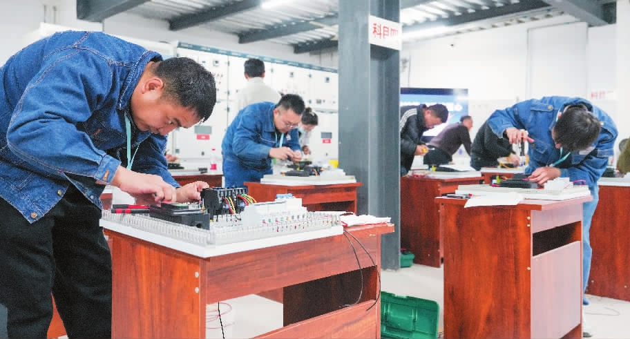 日前,南开区总工会等单位联合举办职工电工技能大赛,30余名职工选手同场竞技。图为选手进行电气设备连线作业比赛。张磊 摄