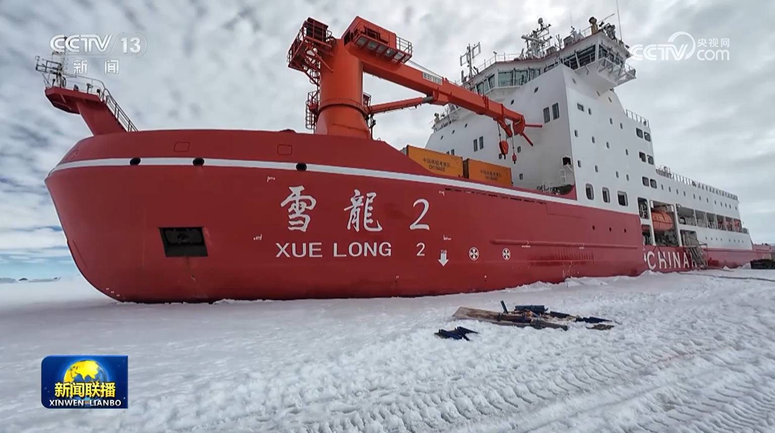 与此同时,在“雪龙2”号30多小时的连续航道拓宽作业和引航下,装载约1500吨物资的“雪龙”号,也顺利抵达海冰卸货作业点。