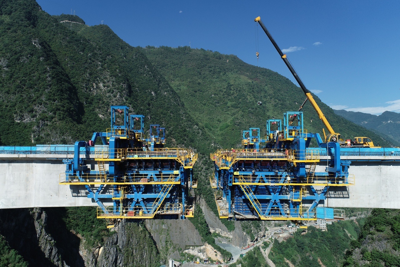 面对山区峡谷复杂环境下高墩、大跨桥梁施工安全风险高的困境,项目建设团队将主梁施工优化为大节段悬浇工艺,最大节段长度调整为6米,悬浇节段数量减少至17节,提前工期2个月。施工采用中铁大桥局研发团队倾力打造的“虹鹰1号”大节段智能悬臂筑桥机,地面拼装后一次整体提升就位,仅用15天完成安装,解决了高墩条件下筑桥机安装风险高、周期长的难题,并且实现了15分钟走行、30分钟调模的高效循环作业,平均9天完成一个节段施工。为落实高质量建设理念,筑桥机集成智能喷淋养护系统,实现全时段远程自动化养护,同时配备全方位安全监控系统,对浇筑应力、走行位移、环境数据等进行实时监测,并设置三级响应机制与声光报警装置,全面保障施工安全。