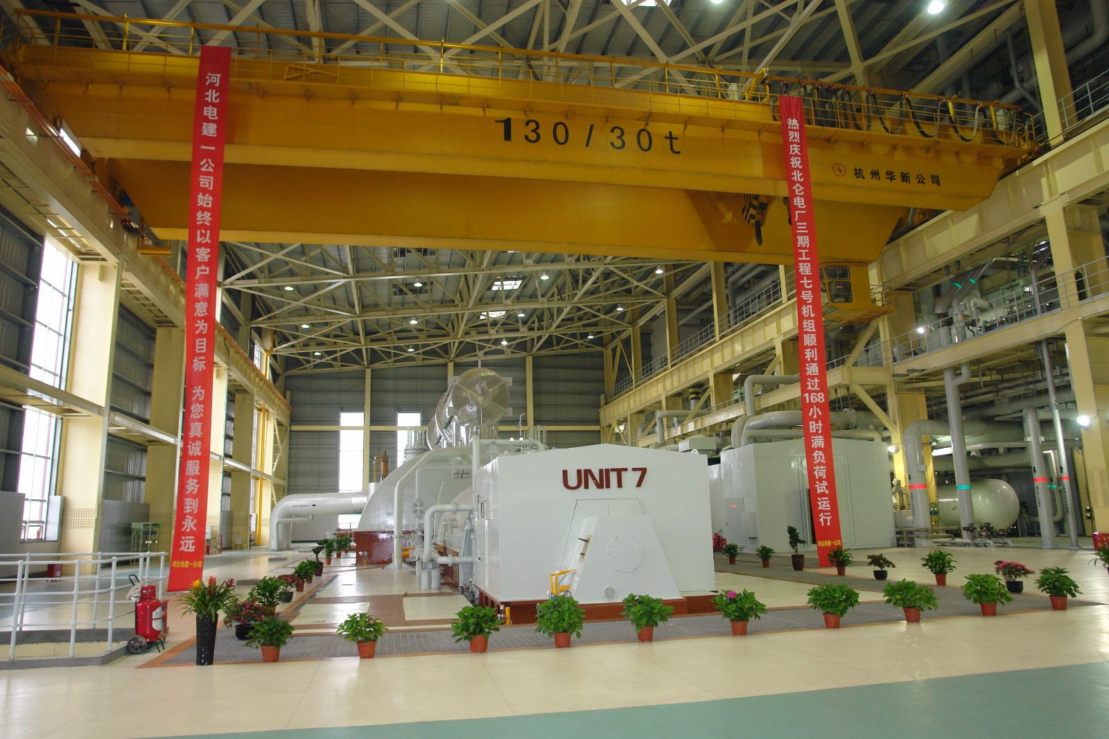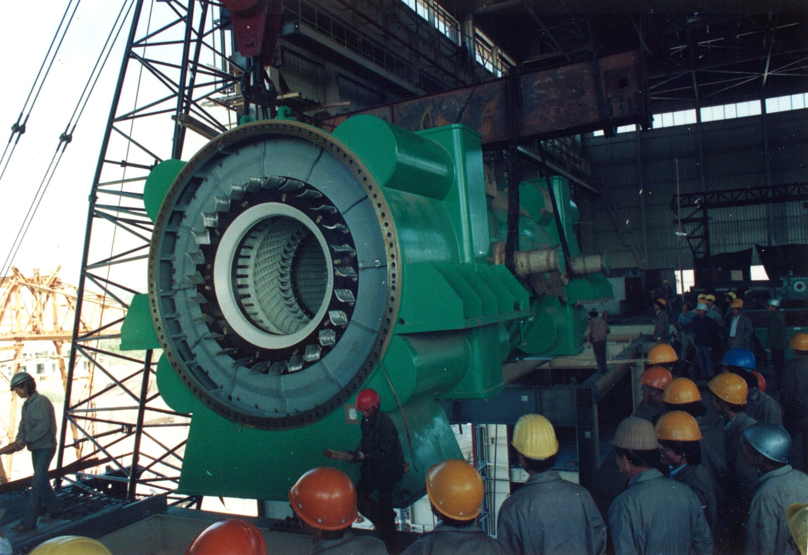 图为1号机发电子定子吊装就位情景 2001年以来,随着中国加入世界贸易组织,大规模基建如火如荼,电力供应进入新一轮紧张期。当年,北仑电厂年发电量占浙江省发电量23.83%。2003年,浙江省提出“宁肯电等发展,不要发展等电”理念,对当地能源建设产生了深远影响。北仑电厂再次抓住发展机遇,2006年7月,北仑三期工程建设两台百万千瓦机组项目获国家发展改革委核准批复。2009年6月,随着7号机组投运,北仑电厂以500万千瓦装机容量,再次成为当时国内规模最大、技术最先进、现代化程度最高的火力发电厂,为浙江打造“世界工厂”提供有力支撑。