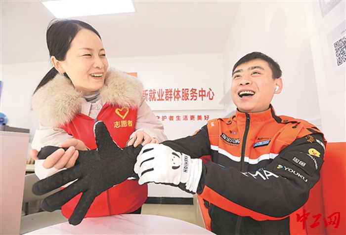 近日,在湖北荆门市东宝区沿河社区新就业群体服务中心,外卖骑手正在试戴保暖手套。