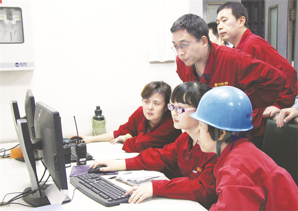 ● 郝金花(前中)正在与班组员工研讨消除隐患的办法。