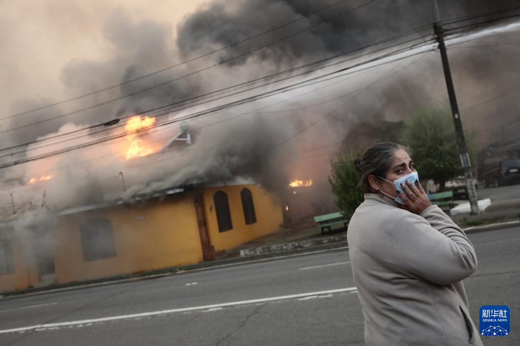1月18日,在智利比奥比奥大区彭科市,一名女子站在燃烧的建筑前。新华社发