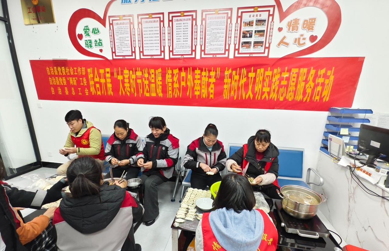 在一年中最冷的节气里,广西河池市罗城仫佬族自治县总工会联合自治县社会工作部、自治县党委“两新”工委,三方联动精心开展“大寒时节送温暖・情系户外奉献者”新时代文明实践志愿服务活动。活动聚焦环卫工人、快递员、外卖员等一线户外劳动者,用暖心举措送上冬日关怀,让寒风中的“城市奔跑者”真切感受到党和政府的关怀,以及工会“娘家人”的温暖与牵挂。 1月20日上午10时许,在罗城仫佬族自治县东门镇长春路2号的工会驿站里,暖意融融,烟火气十足,驿站工作人员与志愿者们早已忙碌开来。大家分工协作,备好新鲜面皮、鲜香馅料和各类餐具,主动邀请户外劳动者一同动手包饺子。大家围坐在一起,手法娴熟者耐心指导新手,欢声笑语中,一个个形态各异的饺子渐渐摆满托盘。“平时忙着跑单,很少有机会参加活动,现在和大家一起坐下来包饺子,这种热闹的感觉就像过年一样,非常感谢工会组织惦记着我们。”快递员郁罗清一边包饺子,一边笑着说道。当一锅锅热气腾腾的饺子出锅,大家围坐品尝,鲜香的滋味在口中蔓延,更在彼此心间架起了温暖的桥梁,让户外劳动者们在忙碌的工作间隙,真切感受到家的温馨。 除了暖心的美食,主办方还为户外劳动者们准备了实用的慰问物资。围裙、纸巾和环保袋,虽都是日常用品,却精准贴合了户外工作者的实际需求,承载着工会与社会工作部的贴心关怀。现场工作人员逐一将物资送到大家手中,叮嘱大家在冬季户外作业时注意防寒保暖,做好安全防护。 活动现场还同步开展了普法宣传服务。志愿者们结合户外劳动者的工作特点,用通俗易懂的家常话,重点讲解了劳动报酬、工伤保险、权益维权等与自身息息相关的法律知识,发放普法宣传资料,现场解答大家提出的疑问。 近年来,罗城仫佬族自治县总工会始终把户外劳动者和新就业形态劳动者服务工作摆在重要位置,依托工会驿站这一重要阵地,持续开展形式多样的关爱服务活动,用实打实的举措解决劳动者急难愁盼问题。此次“大寒时节送温暖・情系户外奉献者”新时代文明实践志愿服务活动,是罗城总工会联合相关部门深化“我为群众办实事”实践活动的又一具体体现。 下一步,罗城仫佬族自治县总工会将继续联合各方力量,不断丰富服务内容、提升服务质效,让工会驿站真正成为户外劳动者遮风挡雨、补充能量的“暖心港湾”。