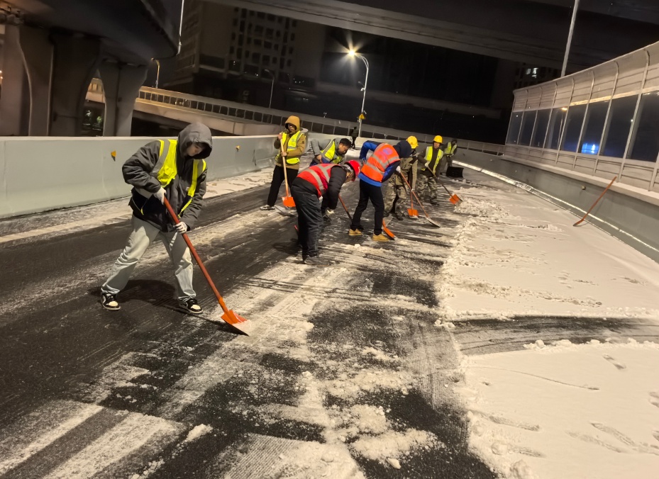 1月19日晚,武汉迎来新年首场降雪,寒潮裹挟着雪花席卷全城,气温骤降至-2℃,路面结冰风险陡增。当日9时武汉已启动低温雨雪冰冻灾害四级应急响应,洪山区高新大道作为连接城市枢纽的交通要道,首当其冲面临冰雪考验。中铁武汉电气化局城建公司4个项目群临危受命,闻令即动,一场与冰雪赛跑的除冰保通战迅速打响。 指令下达后,公司4个项目群快速集结力量,各自组建4支专业抢险救灾除冰队,16支队伍共计90名队员火速到岗,枕戈待旦。抢险物资同步调配到位,除冰车、撒布机等机械装备轰鸣待命,铁锹、扫帚、环保融雪剂、防滑砂砾等物资分类装车,短短1小时内完成全部集结准备,在地方政府统筹调度下,向着高新大道疾驰而去。 此时的高新大道已寒风凛冽,零星雪花飘落,桥面和隧道出入口因温度更低,已出现薄冰迹象。队员们身着反光背心,迅速按照预案划分责任区域,奔赴主干道、桥梁隧道及地铁线周边交通枢纽等关键点位,在冻雨雪大规模降临前完成全部部署。“桥梁是重点,先清桥面再扫匝道,融雪剂撒布要均匀!”现场负责人一声令下,抢险作业正式展开。 机械作业组率先发力,除冰车沿着高新大道主路缓缓推进,铲雪铲精准切入薄冰与路面间隙,将冰层逐一破除、推送至路边,紧随其后的撒布机均匀喷洒环保融雪剂,抑制新冰生成。对于机械无法抵达的隧道边角、桥面伸缩缝等区域,人工组队员手持铁锹俯身作业,指尖被寒风冻得通红仍不停歇,有的用扫帚清扫残留积雪,有的徒手清理缝隙内的冰碴,默契配合筑牢通行防线。雪势逐渐加大,能见度不断降低,队员们顶风冒雪坚守岗位,轮换作业不松懈。 在高新大道关山大道站,队员们重点清理站台出入口及周边路面,铺设防滑砂砾,为夜间出行市民筑牢安全屏障;在隧道出入口,大家加密融雪剂撒布频次,安排专人值守巡查,实时监测路面结冰情况。寒风吹透衣物,雪花落在肩头、睫毛上凝结成霜,队员们搓搓手、哈口气,便立刻投入战斗,汗水与雪水在身上交织成痕。从暮色四合到深夜时分,队员们连续奋战五个小时,清理积雪结冰路段5公里,全面完成高新大道主干道及重点点位的除冰保通工作。 当最后一处结冰路段清理完毕,过往车辆平稳通行,灯光在洁净的路面上划出流畅弧线,队员们才得以稍作休整,脸上露出疲惫却安心的笑容。