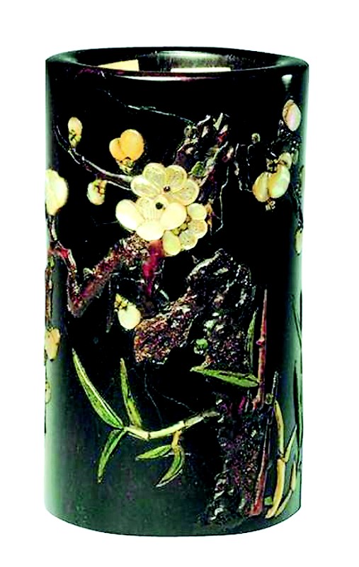 作为文房器具,这件笔筒的价值不仅在于工艺的精湛,更在于其承载的深厚文化内涵与文人情怀。梅与竹历来是中国传统文人的精神象征,被誉为“岁寒三友”之二,梅以傲雪凌霜、暗香浮动的品格,象征文人的坚韧不屈;竹以中空有节、清逸挺拔的姿态,代表文人的虚心自持与高风亮节。将梅竹纹样镶嵌于笔筒之上,并非偶然,而是文人将自身品格与精神追求寄托于器物的直接体现。清代文人对文房器物的选择,往往超越了实用功能,更注重器物所承载的文化寓意与精神共鸣。这件笔筒置于书案之上,既可供收纳毛笔之用,又能在文人挥毫泼墨之余,以其清雅的纹饰与高洁的寓意滋养心境,成为文人精神世界的物化载体。 王婉若