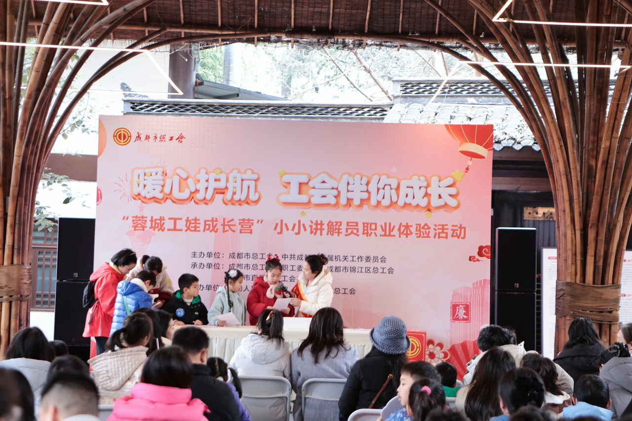 “李先生独立、进取、厚爱的家风美德,感染着我们现场的每一个人!”1月31日,“暖心护航 工会伴你成长——‘蓉城工娃成长营’小小讲解员职业体验活动”在位于成都市锦江区狮子山街道的李劼人故居·职工家庭家风服务中心开展,参与小讲解员体验环节的工娃们争先恐后。 此次活动由成都市总工会与中共成都市直属机关工作委员会主办,成都市总工会女职工委员会、锦江区总工会、成都市直属机关工会委员会承办。此次活动将工匠课堂、家风展示、职业体验、非遗深度融合,打造了一场“行走的家风课”,让劳模精神、劳动精神、工匠精神在亲子互动中传承,让优良家风在沉浸式体验中扎根。 活动现场,由“成都工匠”袁红燕担任主持,通过互动提问,巧妙穿插劳模工匠奋斗事迹,让职工家庭在温馨互动中近距离触摸匠心、感悟初心,推动工匠精神在家庭中传承、在代际间传递,为活动注入浓厚的文化底蕴与精神力量。四川省五一巾帼标兵、成都市五一劳动奖章获得者、家政行业工会主席——新就业形态劳模代表颜玲现场分享收纳整理小妙招,同时结合自身奋斗历程与家庭相处点滴,以“匠心传家”为主题,用朴实的话语讲述了如何平衡职业责任与家庭担当,分享如何将岗位上的专注、细致与责任感,转化为日常生活中的家风教养。 沉浸式职业体验环节,活动紧扣“工会搭台、实践育人”理念,依据孩子年龄特长分组开展“小讲解员”“小引导员”职业体验。岗前培训中,工会特意融入劳模工匠奋斗案例,让孩子们明白“每份职业都需坚守与担当”;实践中,小讲解员们声情并茂讲述生平事迹,小引导员们镇定处理突发场景、贴心服务“游客”,在岗位实践中体会劳动价值,践行“认真负责”的劳动精神,锻炼孩子们的表达应变能力,让工匠精神的“责任与坚守”、劳模精神的“担当与奉献”具象化、可感知。当天,活动还设置了糖画、剪纸、春联书写三大传统年俗体验区。巧妙地将未成年人保护知识、女职工权益维护知识与家风文化知识,融入非遗体验的各个环节,打破传统宣讲模式,让职工与孩子们在指尖传情、墨香萦绕的沉浸式体验中,春风化雨般汲取知识养分,实现文化传承与知识普及的双向赋能。 据介绍,本次活动是成都市总工会服务职工家庭、丰富职工文化生活的一次生动实践。通过整合李劼人故居等优质本地文化资源,实现了非遗传承、职业体验、家风培育与关心关爱女职工的有机结合。下一步,成都市总工会将持续优化“工娃成长计划”,深化“劳模工匠引领+职业体验+亲子互动”特色模式,开展更多形式新颖、内涵丰富的活动,让劳模精神、劳动精神、工匠精神照亮更多职工家庭,让优良家风代代相传,以精准服务为女职工及家庭保驾护航,书写新时代职工家风建设与工会服务工作的新篇章。