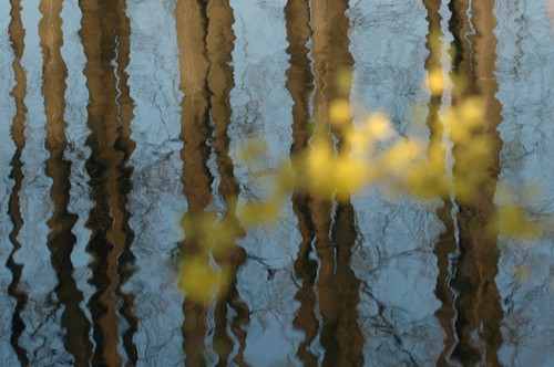 正常的拍摄一般都要求焦点清晰,从而让主体清楚地呈现出来,但是有时候,有目的地在画面中使一部分景物焦点虚化,也是摄影表现的技法之一。比如图中,通过有选择地把前景枝叶放在焦点之外,摄影师有意越过前景,只对后方水面中的树林倒影进行对焦,从而使枝叶变成了陪衬的前景,虚实对比给人深刻的印象。 |