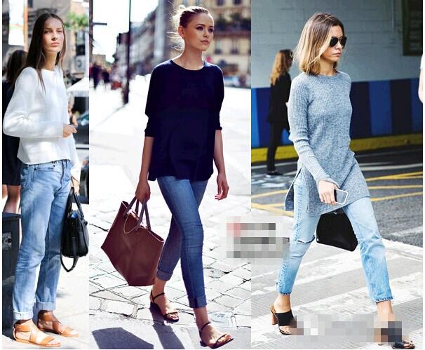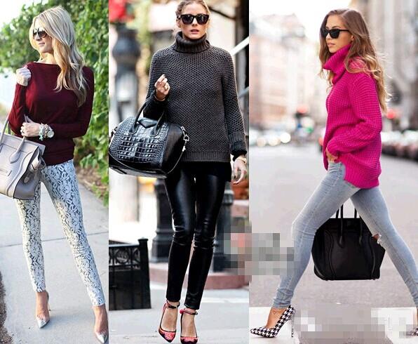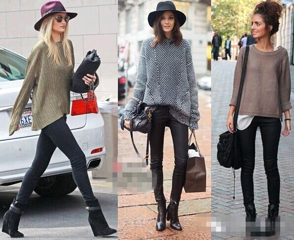 最简单的显胖毛衣,用上纤细的铅笔裤进行化解,这是最简单也最不容易出错也是最容易出现在你大脑的搭配方法了吧~百试不厌好么?  初秋的时候搭配单鞋、板鞋、乐福、一脚蹬甚至凉鞋……,这搭配是毫无难度滴~当然你至少需要掌握的是:花色铅笔裤搭配纯色毛衣,毛衣长度最好刚刚盖过你的臀部。  当然了在你把各色铅笔裤和各种鞋子尝试了一遍之后,最屡试不爽的一定是大饼的秋冬万用黑黑好基友,黑色铅笔裤+黑色长短靴毛衣随你来。  ⑥另一百搭种子手 牛仔裤  说完上一个百搭,你还不要忘了的百搭品就是牛仔裤,所向披靡的单品,你可以与你的各种毛衣皮匹配。 -----------
