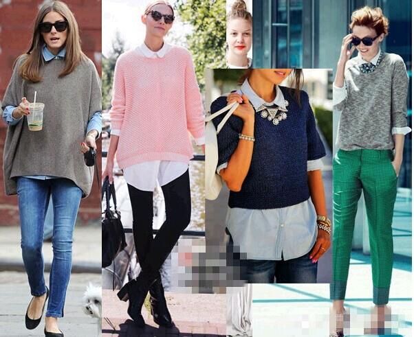 ③你可以用衬衫打底,让你的毛衣更加多样化,并且适当的优化你的V字部位。短毛衣+衬衫 也是一种高腰线的打造方式。 白衬衫和牛仔衬衫无敌好用 也是大饼的基础单品系列,纯色的毛衣要想玩些花样,就小试你的复古、波点等花色衬衫吧~