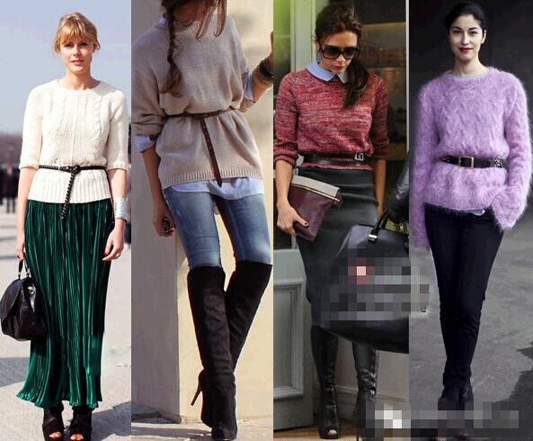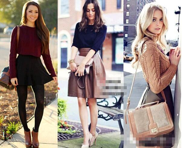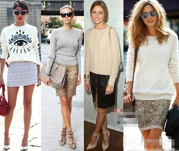 搭配蓬松的阔摆裙,短打毛衣或者将毛衣塞到裙子里,这样的打扮都能让你散发青春感~轻松营造的高腰线,显高显瘦的这一搭似乎每人必会。  当然值得注意的是:A型姑娘的阔摆裙建议不要选择mini短裙,O型有肚子的姑娘,可以尝试稍稍把裙子往上提哦~  这一搭实在是毫无难度,你需要的只是找到适合你的裙子&适当的调整你的裙子位置。  高腰线虽然重要,但是并不是必备法则。如果美腿是你的优势,那么随意的穿着你洗衣的毛衣,搭配短款阔摆裙,就算没有高腰线一样显高,这一搭有小肚子的O型姑娘不妨试试哦~ ②毛衣+包臀裙 温柔&干练两不误