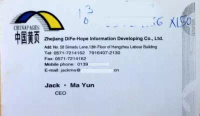 第四张名片大约是阿里巴巴的创业初期,B2B为主营业务的时代。名片上的公司地址是阿里的第二个办公地址。从名片材质看,简直太!破!了!不忍直视。