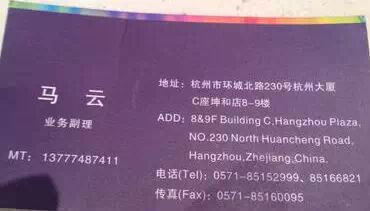 第一张名片没有标明公司,播打名片上的电话13777487411提示已停机,办公地点杭州大厦,马云的首次创业“海博翻译社”地址曾在此大厦附近。这张纸质名片,是紫色的,显得妖气十足,“业务副理”这种Title往往出现在那些皮包公司或者拉皮条的贸易公司内部,可推测是马云进入互联网行业之前。