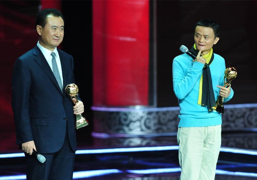 2012年12月12日,2012年CCTV中国经济年度人物评选颁奖盛典暨2012央视财经论坛在北京举行。王健林与马云。现场两人抛出1亿豪赌实体店与电商未来。