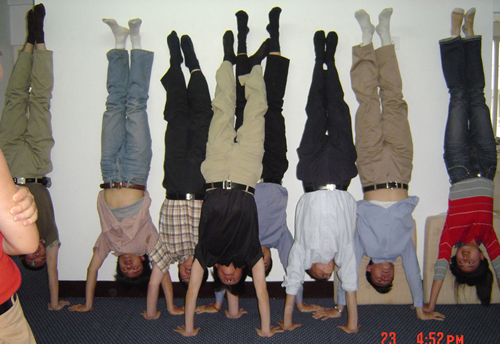 第二个是倒立文化。倒立是阿里巴巴内部经常做的体操——血压高的同志还是以后不要去阿里巴巴上班了。图为阿里的倒立文化。
