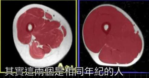 这是两位体重、腿围、年龄均相同的男性大腿剖面图,左边是少肌型肥胖者,右边属于正常者。