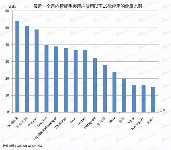 当前智能手表的用户主人使用的应用程序也同样暴露他们的一些使用习惯。数据显示,最近1个月内超过50%的智能手表用户每个月使用Facebook和谷歌地图应用。很明显,社交和地图功能深受智能手表用户的喜爱,这也是为什么那么多公司愿意花时间来使自己的App来适配苹果的Apple Watch。 |
