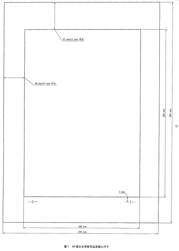 | 公文用纸天头(上白边)为37 mm±1 mm,公文用纸订口(左白边)为28mm±1mm,版心尺寸为156 mm×225 mm。 |