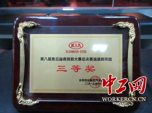 东台农民工再次登上领奖台 ——江苏悦亚公司农民工参加全国技能大赛并获奖 现年29岁,只有高中文化程度的葛正祥来自江苏东台城东垛团村,2012年进城务工进入江苏东台悦亚汽车销售有限公司成为了一名汽车修理工。近年来,他在公司工会帮助下,刻苦钻研汽车修理和油漆技术,经常参加公司工会组织的各类业务培训、劳动竞赛、技术比武和技能大赛,很快成为公司的一名技术能手。今年5月,他代表公司参加悦达·起亚(南京)赛区汽车售后服务技能大赛,不负众望、技压群雄,夺得 (南京)赛区汽车售后服务技能大赛油漆技师组一等奖。前不久,葛正祥再次代表公司赴杭州,参加由悦达·起亚举办的全国汽车售后服务技能大赛,经过紧张的角逐,他从众多选手中脱颖而出,荣获东风悦达·起亚第八届售后服务技能大赛总决赛油漆技师组三等奖。据悉,此次技能大赛高手如云,共有来自全国各地的近200名能工巧匠报名参赛。赛后,葛正祥表示:“回到公司后将继续刻苦钻研技术,并带领更多的农民工兄弟学技术、练本领,为汽车添彩,为农民工争光。”
