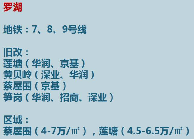 罗湖的旧改说得最久的应该是蔡屋围京基的旧改,还有新出的莲塘的旧改,还有黄贝岭和笋岗的旧改,莲塘的旧改现在是华润和京基在谈,黄贝岭的深业东岭已经入市了,后面还会有华润在湖贝村的旧改。再就是蔡屋围旧改,最后是笋岗,笋岗现在已经开始拆迁了,以做汽车产业、做物流为主,现在有华润、招商、深业。
