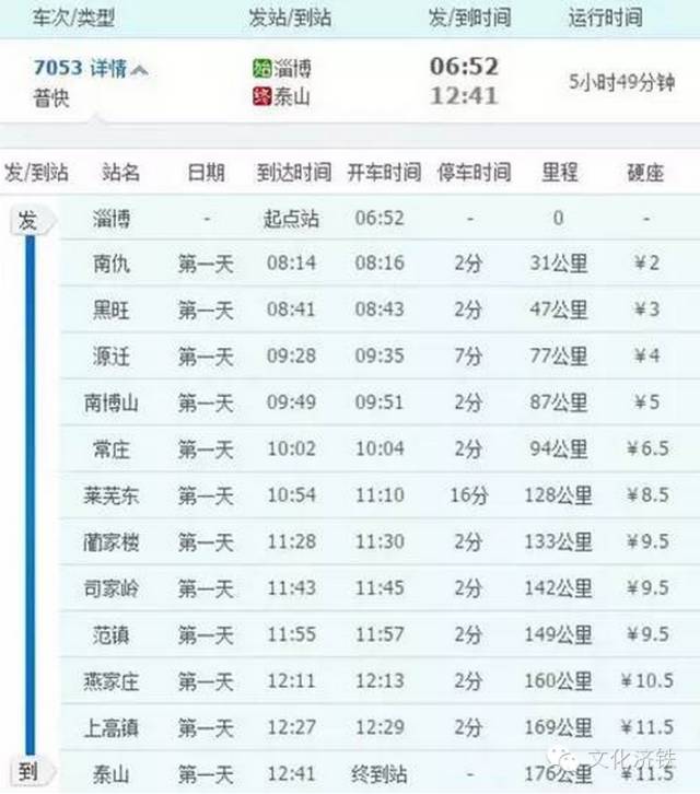 从时刻表上不难看出,淄博到泰山共13个站点,176公里,历时5小时49分钟,别看运行速度不能和高铁相比,票价最低2块,最高11块5,可不是一般的便宜!