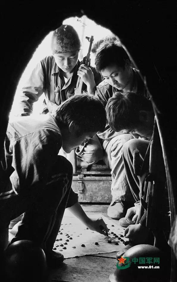 | 驻守在云南老山边境的某部官兵在猫耳洞里"排兵布阵" 苦中作乐。 |