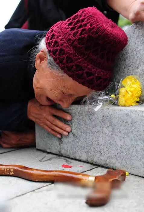 | 从湘西凤凰县千里迢迢赶来的95岁老人滕清莲终于来到儿子田拥华的墓前,禁不住老泪纵横:"儿啊,31年了,娘可算看到你啦!"老人甩开手杖,一下子扑在墓上嚎啕大哭。 |