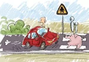 张三在山间小路开车,正当他悠哉欣赏美丽风景时,突然迎面开来的货车司机摇下窗户大喊一声:“猪!”张三越想越气,也摇下车窗大骂:“你才是猪!”刚骂完,他便迎头撞上一群过马路的猪。